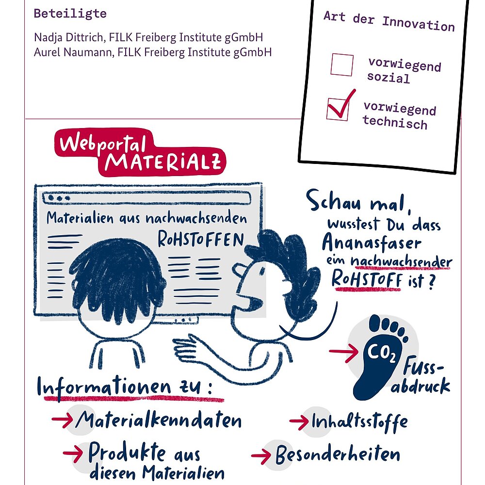 Im Rahmen des Projektes sollen wissenschaftlich ermittelte Materialinformationen im Format eines Webportals für die Gesellschaft zugänglich gemacht werden. Durch eine Übersetzung dieser objektiven Kenndaten in eine für alle verständliche „Sprache“, ist ein Transfer von der Wissenschaft in die Praxis möglich. Dadurch können neue und nachhaltige Materialien bekannter gemacht und neue Anwendungsmöglichkeiten erschlossen werden. Außerdem werden gesellschaftliche Fragen wie Ressourcenschonung, Kreislaufwirtschaft, Umwelt- und Gesundheitsschutz sowie die Knackpunkte Schadstofffreiheit, ökologischer Fußabdruck und soziale Verantwortung adressiert. Durch die Mithilfe der Portalnutzer, insbesondere der Generation Z, wird ein direkter Austauschkanal zwischen Hersteller und Nutzer über die Funktionalität der Materialien geschaffen. Außerdem werden in die Entwicklung des Webportals Alltagspersonen (insbesondere Vertreter aus der Generation Z) einbezogen.