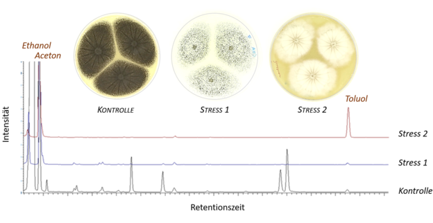 Obwohl das Volatilom Aufschluss über den Stoffwechsel von Mikroorganismen geben kann, war vergleichsweise wenig bekannt darüber, welche Substanzen genau mit einem erhöhten Stresslevel assoziiert sind. Es wurde daher zunächst untersucht, unter welchen Bedingungen Stress induziert werden und wie dieser quantitativ erfasst werden kann. Es konnte festgestellt werden, dass eine Einschränkung des Nährstoffangebotes (Kohlenstoff- und Stickstoffquelle, Spurenelemente) sowie Änderungen im pH-Wert geeignet waren, um für die Pilze nachteilige Wachstumsbedingungen zu schaffen. Dies äußerte sich vor allem in einem verminderten Wachstum und einer verringerten Sporenbildung.