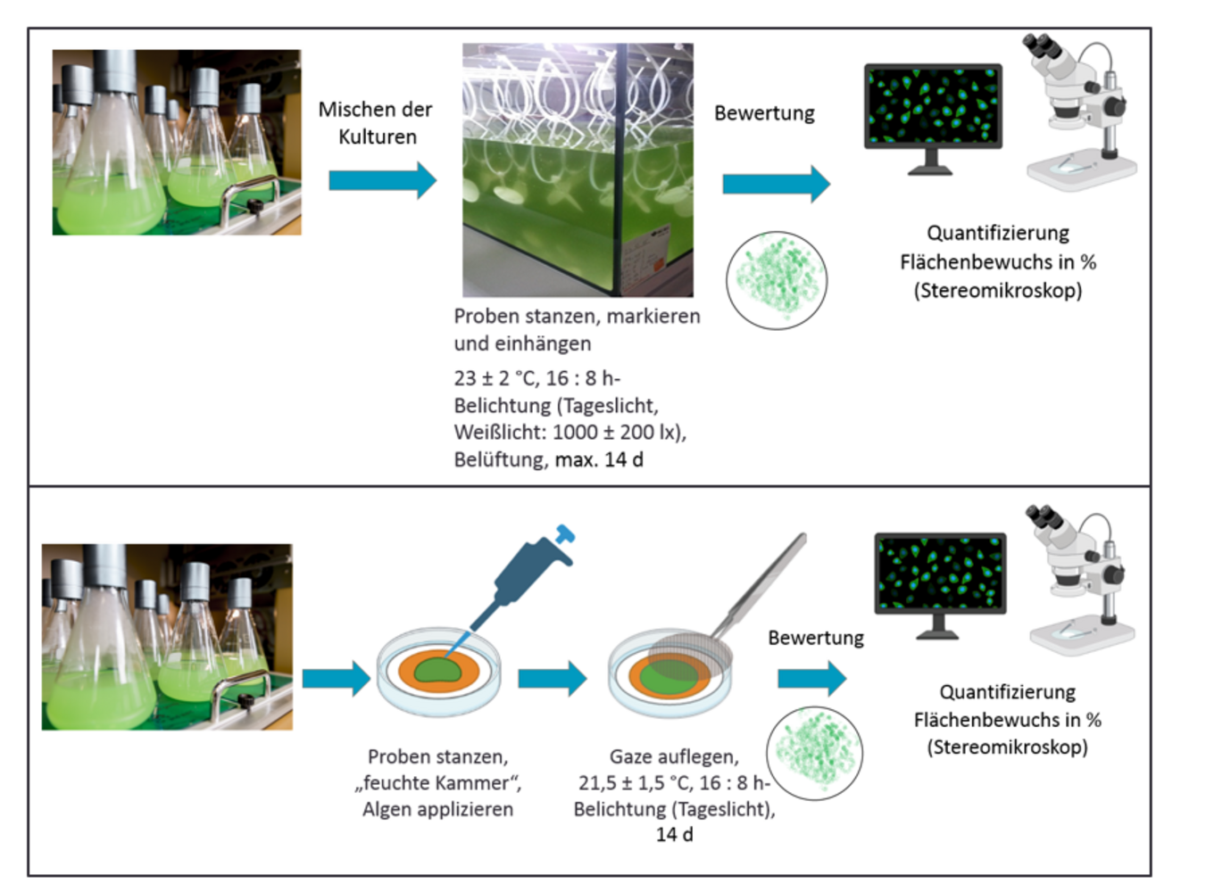 Im Rahmen des Projekts konnten die grundlegenden Voraussetzungen für ein Laborverfahren zur Ermittlung des Algenaufwuchses unter limnischen und aeroterrestrischen Bedingungen geschaffen werden. Die methodische Basis wurde systematisch weiterentwickelt und durch Optimierungsmaßnahmen ergänzt, welche die Effektivität und Reproduzierbarkeit deutlich verbesserten. Dazu zählten unter anderem die Anpassung von Versuchsanordnungen, die Auswahl geeigneter Algentypen sowie die Standardisierung von Inkubations- und Auswertungsprozessen. Die Laborversuche erwiesen sich insbesondere für die gezielte Eingrenzung und Bewertung von Strukturparametern mikrostrukturierter Folien sowie der Materialrezepturen als geeignet. Allerdings lassen sich komplexe Umweltfaktoren wie Strömungseinflüsse, Klimadynamiken oder natürliche Biozönosen nur bedingt unter Laborbedingungen abbilden. Für eine belastbare Bewertung der antifoulingwirksamen Eigenschaften unter realistischen Einsatzbedingungen sind deshalb weiterführende Feldversuche unter natürlichen Umgebungsbedingungen zwingend erforderlich.