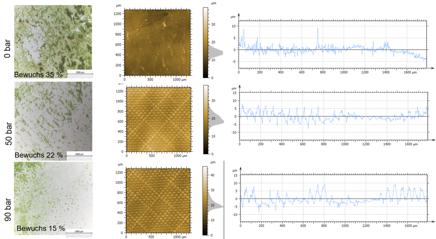 Die Versuche zum Prägen von PVC zeigten, dass durch die Erzeugung mikrostrukturierter Oberflächen ein hemmender Einfluss auf das Algenwachstum erzielt werden kann. Allerdings beeinträchtigt das thermoplastische Fließverhalten der Folienoberflächen die Prägegenauigkeit und -reproduzierbarkeit, wodurch die gewünschte Strukturabformung teilweise abgeschwächt wird. Im Vergleich hierzu verweisen erste Ergebnisse mit laserstrukturierten Folien auf eine deutlich verbesserte Detailgenauigkeit und eine höhere Reproduzierbarkeit der Mikrostrukturen.
